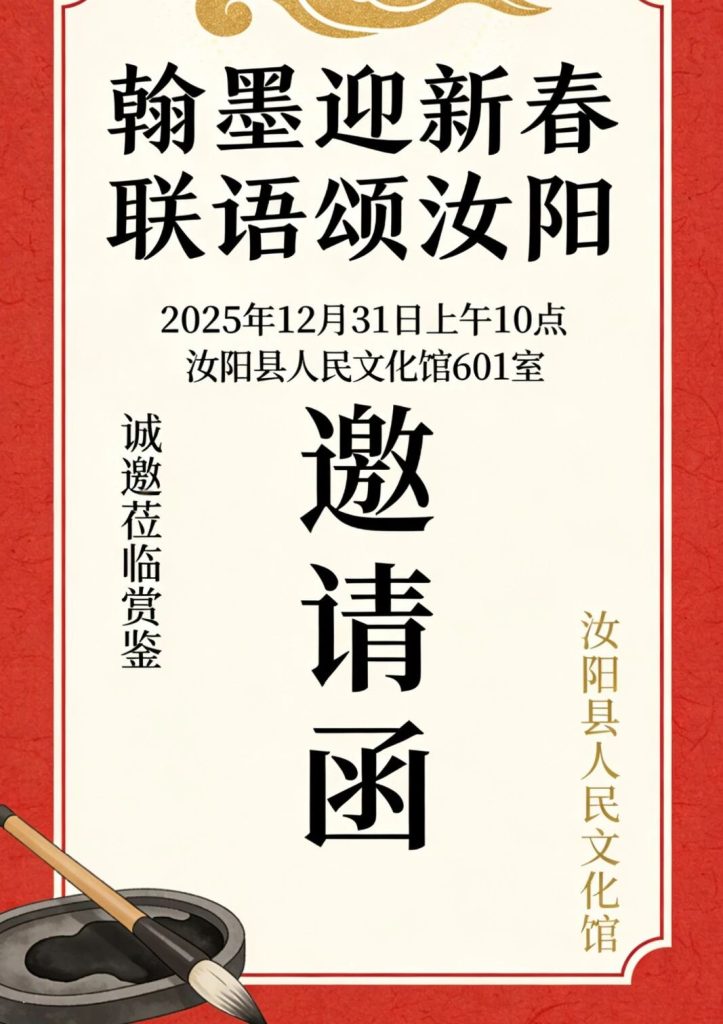兹定于2025年12月31日上午10点,在汝阳县人民文化馆604室举办“欢欢喜喜过大年系列活动”之翰墨迎新春 联语颂汝阳新春楹联书法作品展。