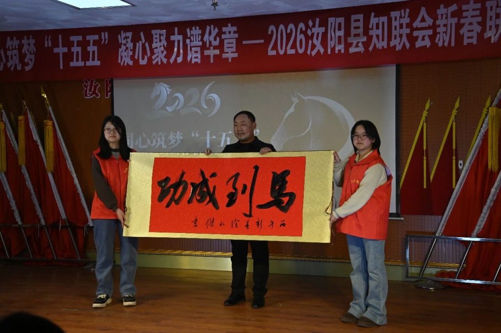 二胡独奏《赛马贺新春》,以激昂的旋律展现出党外知识分子勇毅前行、奋勇争先的奋进姿态;朗诵《中华诵》《爱心公益 与爱同行》,或抒发家国情怀,或讲述公益路上的责任与担当,彰显出汝阳党外知识分子的家国情怀与社会担当;普法宣传三句半以轻松幽默的形式,结合行业法治建设需求,传递法治精神,为行业健康发展筑牢法治根基;歌曲《彩虹》《灼灼韶华》,以温柔又有力量的演绎,唱出了知识分子们对美好未来的憧憬,以及在新征程上逐梦前行的坚定信念。现场书法创作环节,徐永杰老师挥毫写下“马到成功”四个大字,笔力苍劲、寓意深远,既寄托了对汝阳“十五五”发展开好局、起好步的美好祝愿,也表达了党外知识分子们在新征程上建功立业、再创佳绩的坚定决心。